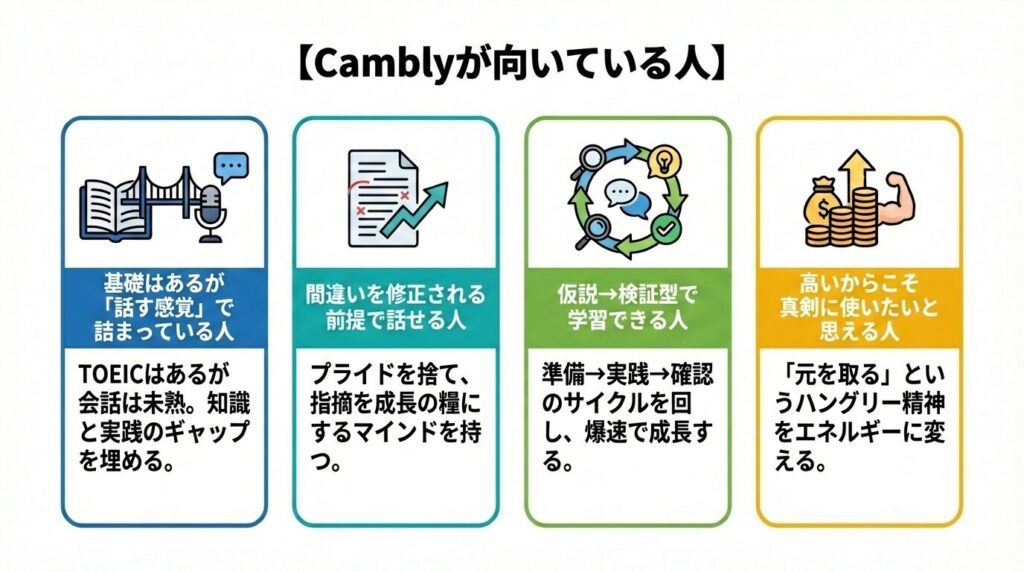 特に中級者以上で、ある程度文法が頭に入っている人にとって、Camblyは「教科書英語」を「使える英語」に書き換える最高の実戦場 になります。