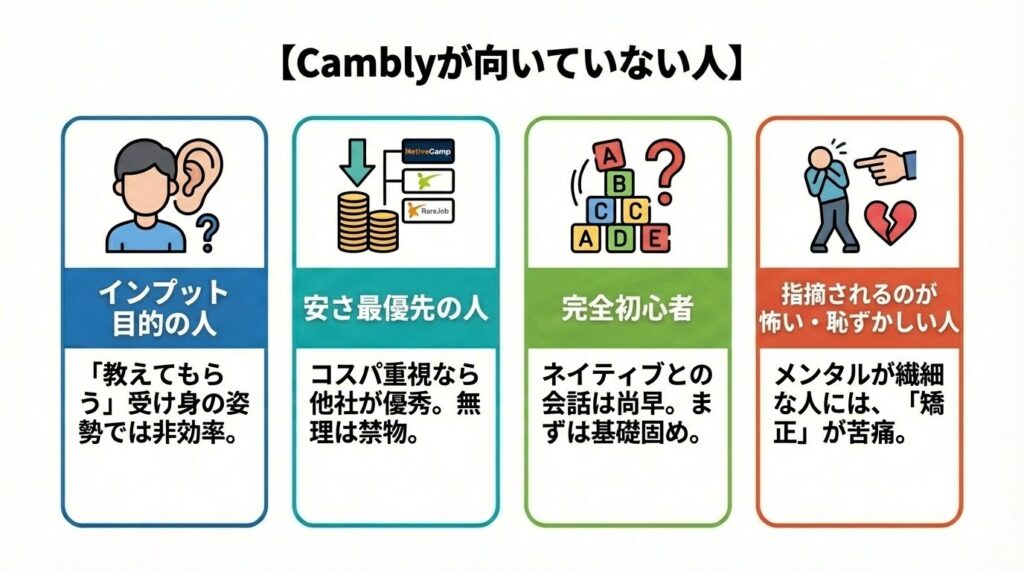いきなり出鼻をくじくようで申し訳ないんですが、Camblyは「誰にでもおすすめできる」ような優しいサービスじゃありません。