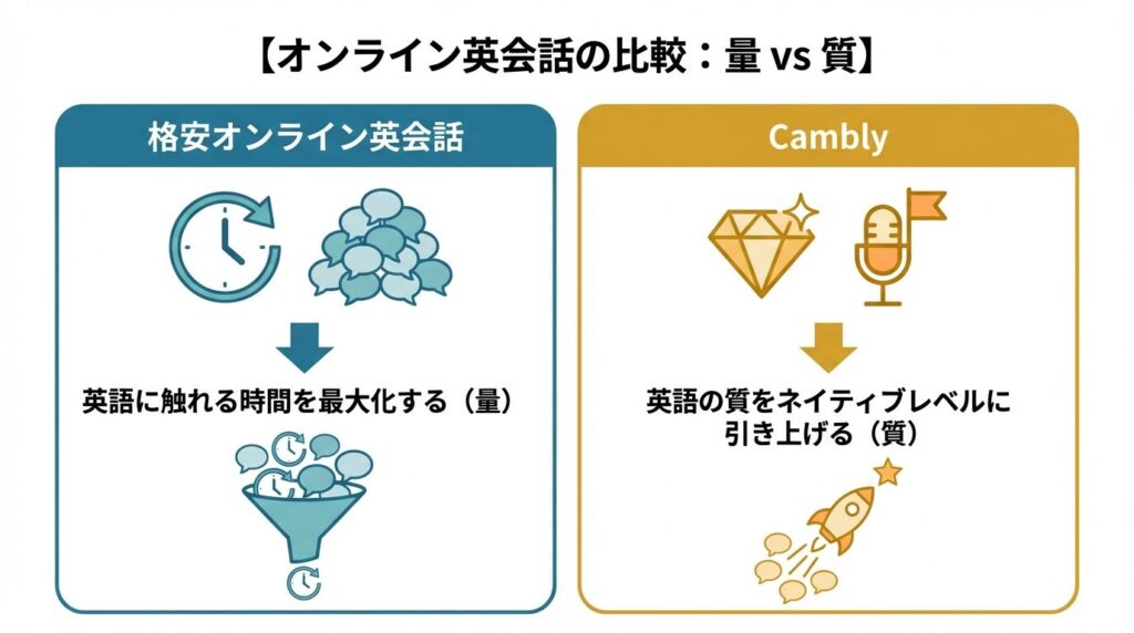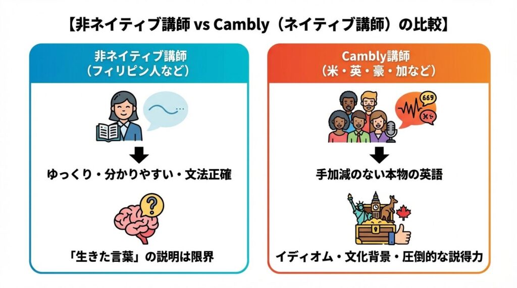鋭いね。正直、講師の当たり外れはあるよ。でもCamblyは「合わないと思ったら数分で切って、別の先生にスイッチ」ができるんだ。この身軽さは、他のサービスにはない強みだね。