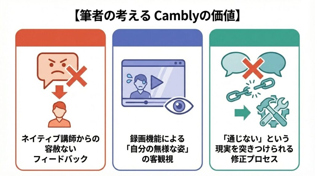 私が2年間、身銭を切って(正直、財布はかなり痛みましたが)使い続けて確信したのは、Camblyの本質は「会話練習の場」ではなく「矯正の場」だということです。