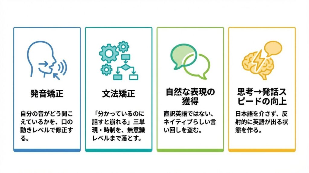 でも、あなたが目指しているのが「通じればいい英語」ではなく、「相手の懐に飛び込める、洗練された英語」なら、ネイティブ講師による「矯正」は避けて通れません。